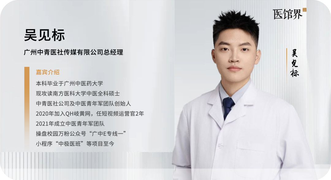 在这片迷茫中,一位在校期间便开始创业的学子引起了医馆君的注意,他本科就读于广州中医药大学,现为南方医科大学中医全科硕士在读生,同时也是中青医社传媒有限公司创始人与中医青年军团队领头人。他便是——吴见标。
